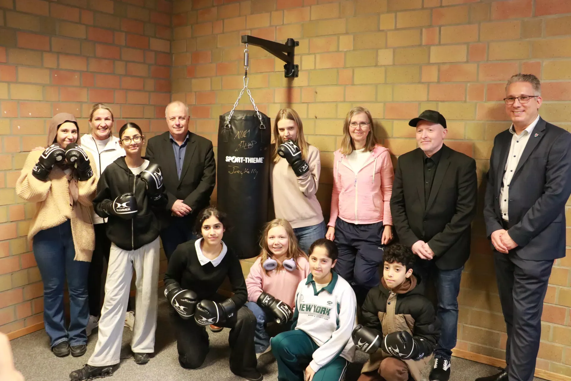 Schulleiter Alfred Himpeler begrüßte die Anwesenden herzlich, sagte Dank und übergab einige Blumensträuße. Im Anschluss lud er alle Interessierten ein, bei der Einweihung unseres neuen Boxsackes dabei zu sein. Konrektor Oliver Leuffen hatte den Beratungsraum persönlich rechtzeitig vorbereitet und eine robuste Aufhängung für den Boxsack besorgt. Die Kinder und Jugendlichen waren begeistert über diese Anschaffung!
